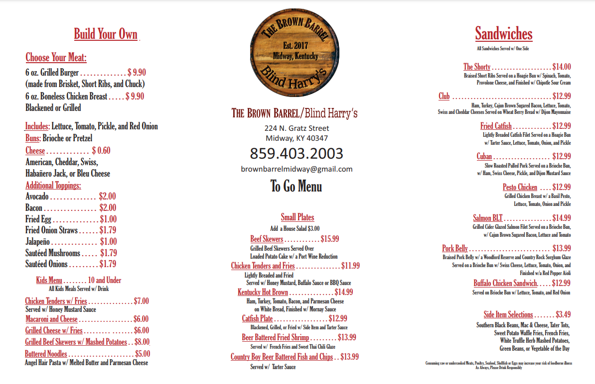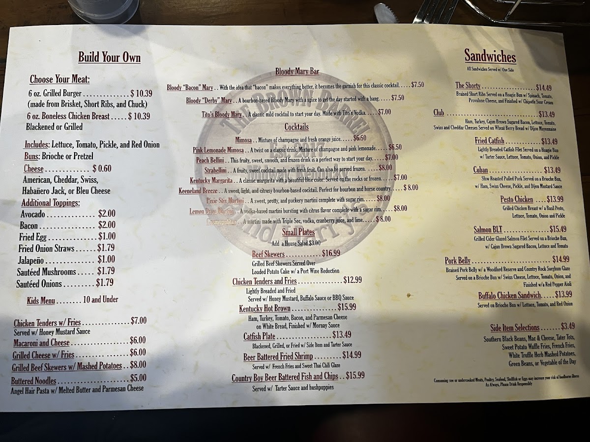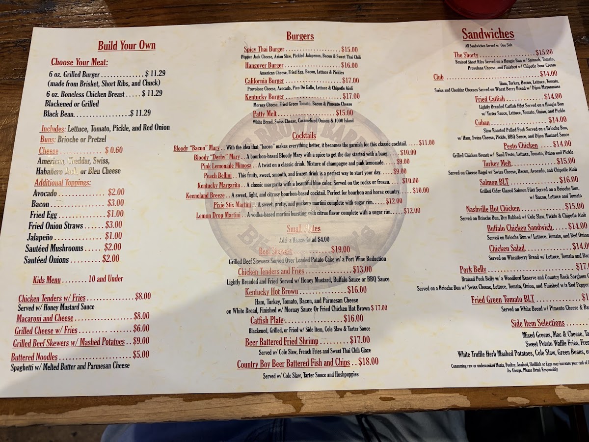 Choose your meat: 6 oz grilled burger (made from brisket, short ribs, and chuck), 6 oz boneless chicken breast, blackened or grilled black bean. Includes: lettuce, tomato, pickle, and red onion. Buns: brioche or pretzel. Cheese for an additional charge: American, cheddar, Swiss, habañero Jack, or bleu cheese. Additional toppings: avocado, bacon, fried egg, fried onion straws, jalapeño, sautéed mushrooms, or sautéed onions.